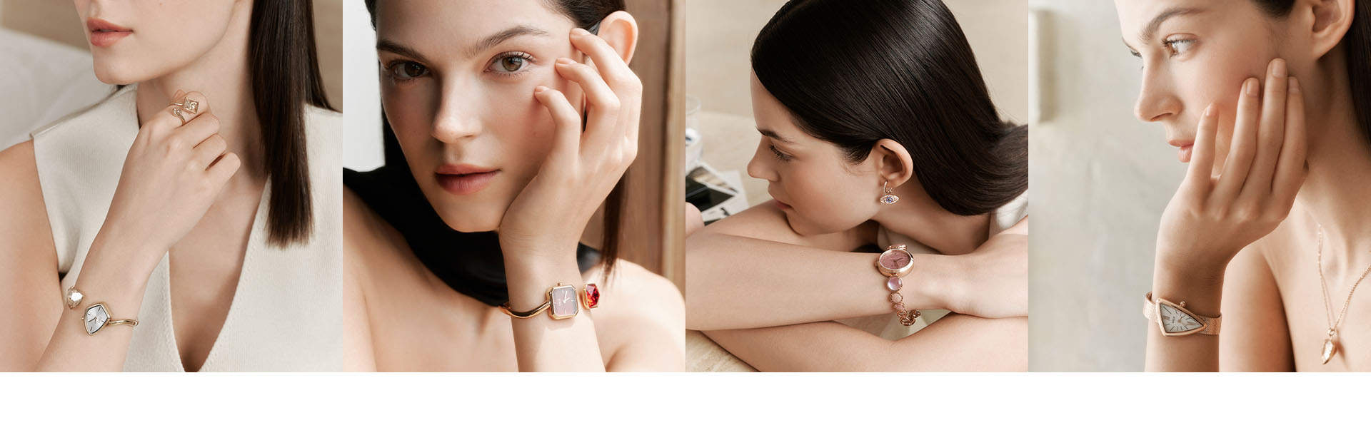 THROUGH MOTHER-OF-PEARL DIALS. LEAF-LIKE CASES & ZIRCON-ACCENTED BRACELETS